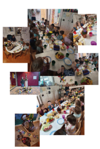 Das Thema „Erntedank“ begleitete die Kinder schon die letzten Wochen über. Vor dem Frühstück wurde nochmals über die Erntezeit, die Feldfrüchte und über das Fest „Erntedank“ gesprochen. Daraufhin bedankten sich alle bei Sonne, Wind, Regen, der Erde und den Bauern für die viele geleistete Arbeit, die zu diesem reichlich gedeckten Tisch führte.